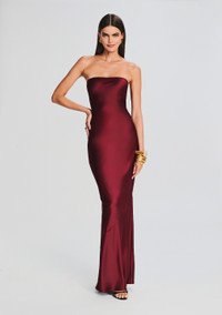 Indulge in elegance and allure with our Keaton Dress. Elevate your style with this exquisite gown boasting a flattering strapless neckline, an alluring open back, and crafted from a sumptuously silky fabric. Designed to captivate attention, this dress embraces sophistication and sensuality. The strapless silhouette offers a chic and elegant appeal while the open back adds a touch of allure, ensuring you radiate confidence and charm. Shown here in Cabernet. - 95% Silk, - 5% Spandex - Made in China - Model is 5'10" wearing size S - Style No. - WEB-6560