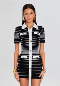 Channel chic energy in our adorable Kiersten Dress. The collared neckline, short sleeves, and figure-hugging fit make it a playful yet sophisticated choice for warm-weather events. Shown here in Metallic Black/White. - 60% Rayon, 32% Nylon, 3% Spandex, 5% Metallic - Made in China - Model is 5'10" wearing size S - Style No. PF24-9425