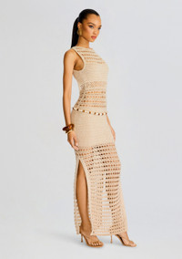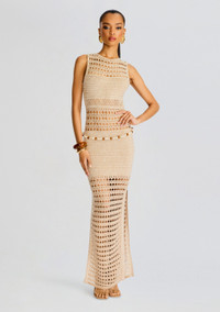 Embrace effortless bohemian chic in the Kylan Dress. This stunning maxi dress, meticulously handcrafted with intricate crochet, embodies relaxed sophistication. Its airy silhouette and delicate details make it the perfect choice for sun-drenched days and glamorous evenings. Shown here in Metallic Ivory Bronze. - 85% Cotton, 10% Polyester, 5% Metallic - Made in China - Model is 5'10" wearing size S - Style No. PF24-9600