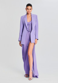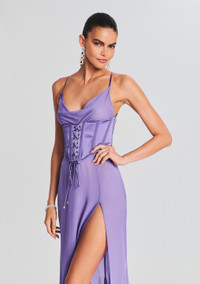 Go for our lavish Larissa Silk Corset Dress. This silk style features a lace-up bodice and an ultra side slit. Shown here in Dusty Lilac. - 100% Silk - Made in China - Model is 5'11" wearing size XS - Style No. PF23-6993