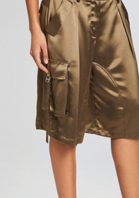 Introducing the perfect balance of chic and edgy fashion– our Mae Short. These shorts feature a knee-length cut and low rise waist for a flattering silhouette that exudes modernity. These cargo shorts offer multiple pockets for holding belongings while maintaining a sleek and streamlined look. Whether you're running errands around town or exploring the city streets, these shorts will be your go to. Shown here in Military Green. - 76% Acetate, 24% Polyester - Made in China - Model is 5'11" wearing size XS - Style No. - SS24-8926