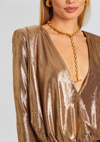 Dazzle and shine in our Marilyn Dress, featuring a sultry plunging neckline and an alluring open back. Crafted to make a statement, this dress is the epitome of glamour and sophistication. Whether you're attending a special event, a cocktail party, or a night out on the town, this dress promises to turn heads and make you feel like a star. Shown here in Bronze Gold. - 92% Polyester 8% Spandex - Made in China - Model is 5'10" wearing size S - Style No. - R24-8410