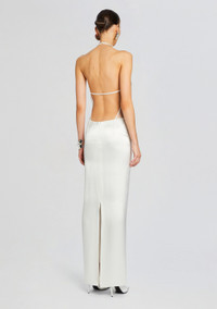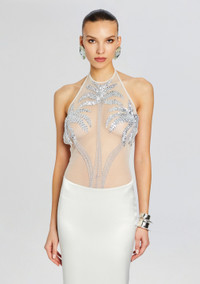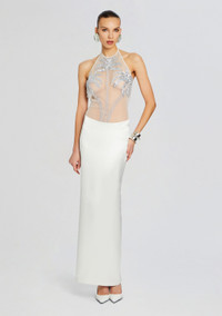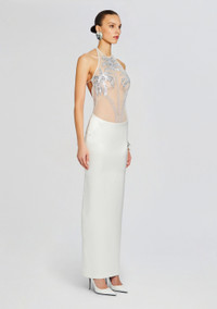 Step into elegance and sophistication with our Meridian Dress, featuring a sheer top adorned with palm tree embellishments for a touch of tropical glamour. With its sleek silhouette and open back design, this gown exudes modern sophistication. Shown here in White. - HANDMADE - Hand-stitched beaded embellishments - 30% Nylon, 50% Acetate, 20% Polyester - Made in India - Model is 5'11" wearing size S - Style No. SS24-8997