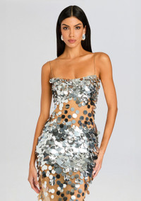 Shimmer and shine in the Mischa Dress. This dazzling creation is adorned with iridescent sequins that catch the light with every move. Its sleek silhouette and sheer detailing exude modern glamour, making it an unforgettable choice for your next special occasion. Shown here in Silver/Nude. - HANDMADE - 100% Nylon - Made in India - Model is 5'10" wearing size S - Style No. - PF24-9244
