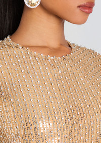 - Allover sequin and crystal embellishment - 100% Nylon - Made in India - Model is 5'10 wearing size S - Style No. - HL25-10983