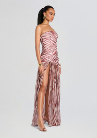 Walk on the wild side with our Nicole Silk Chiffon Dress. This strapless maxi dress features a fierce print with bias-cut, frayed panels throughout the bodice, and a romantic, sheer skirt. A zipper located on the side completes the look. Embrace your adventurous spirit with this captivating dress- crafted to demand attention, this strapless maxi dress boasts a stunning print that exudes fierceness and confidence. Shown here in Earl Rose Zebra. - 100% Silk - Made in China - Model is 5'10 wearing size S - Style No. - FW22-5555