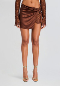 Unleash your inner fashionista with our Reeve Skirt, adorned with intricate lace detail and featuring a flattering low-rise waist. Crafted to exude elegance and charm, this skirt is the perfect addition to your wardrobe for any occasion. Shown here in Espresso. - 95% Silk, 5% Spandex - Made in China - Model is 5'10" wearing size S - Style No. - SS24-9003