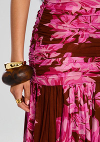 Make a statement in our Teryn Dress. Featuring a strapless design and a flattering ruched bodice, this summer dress is perfect for a beach vacation or a destination event. The flowing chiffon fabric creates a dreamy silhouette, while the pink and brown floral pattern adds a touch of whimsy. Complete the look with strappy sandals and a statement clutch. Shown here in Camellia Reverie. - 100% Silk - Made In China - Model is 5'10" wearing size S - Style No. PF24-9230