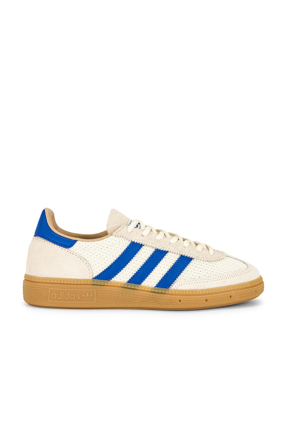 - Leather and textile upper with rubber gum sole - Lace-up front - Adidas Handball Spezial logo patch at tongue - Signature three leather stripes at side panels - Lightly padded low-cut collar with leather lining - Revolve Style No. AORI-WZ209 - Manufacturer Style No. JS3865
