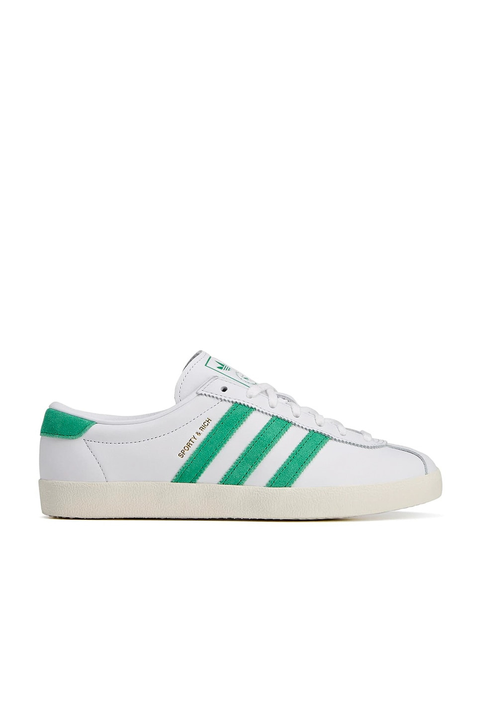 - Leather upper with suede trim and rubber sole - Lace-up front - adidas x Sporty & Rich co-branding throughout - Removable 'Racquet' key ring - Collapsible construction that makes it light and comfortable - Additional laces included - Revolve Style No. ADIO-MZ357 - Manufacturer Style No. JP7552