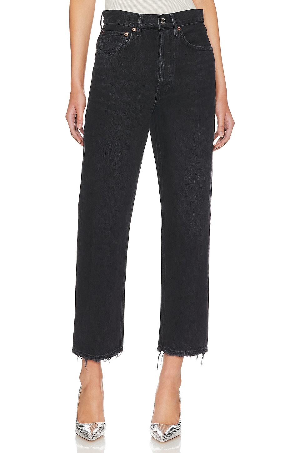 - 100% regenerative cotton - Made in Turkey - Machine wash - Button fly.5-pocket styling - Light whiskering and frayed hem - Rigid denim fabric.18.5" at the knee narrows to 12.5" at the leg opening - Revolve Style No. AGOL-WJ457 - Manufacturer Style No. A173E-1157