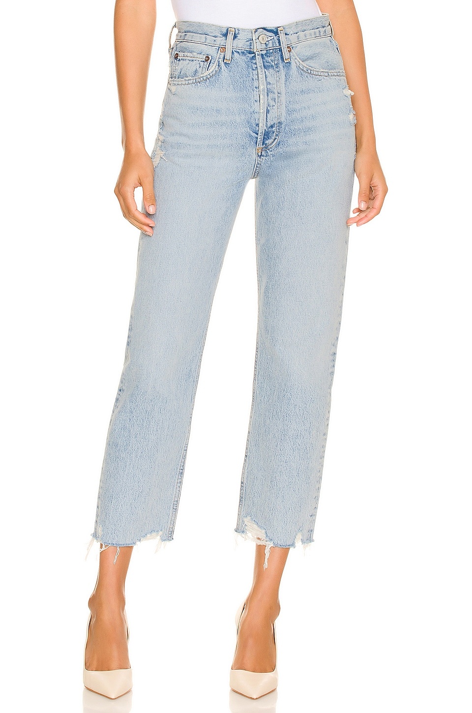 - 100% organic cotton - Made in Turkey - Machine wash - Button fly.5-pocket styling - Light whiskering and intentionally destroyed detail - Rigid denim fabric with frayed hem.14.5" at the knee narrows to 12" at the leg opening - Revolve Style No. AGOL-WJ383 - Manufacturer Style No. A173-1206