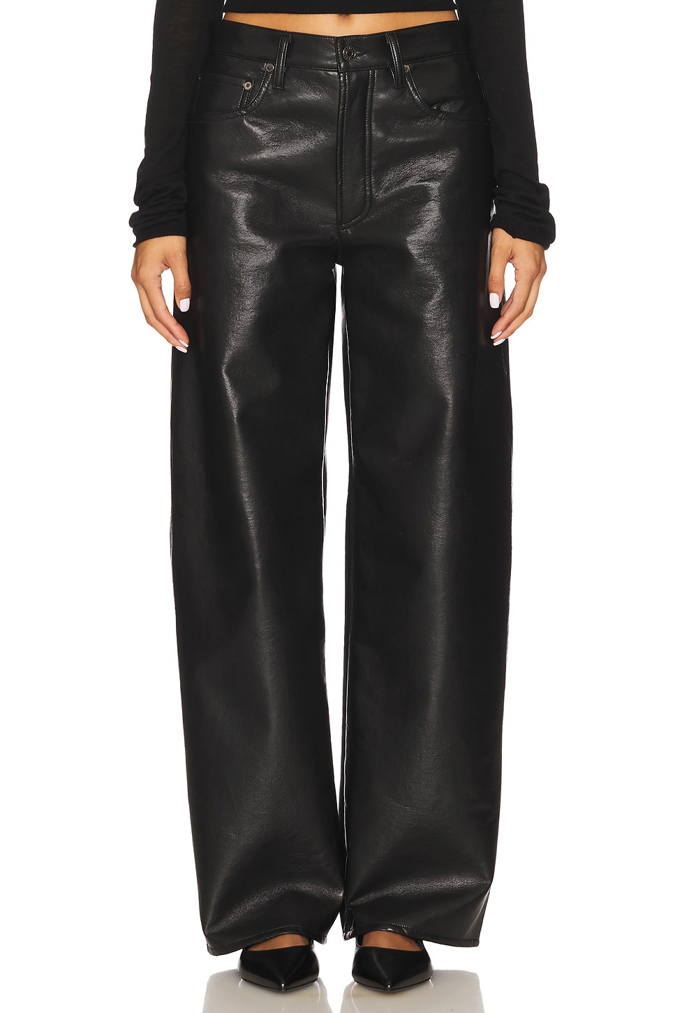 - Shell: 50% recycled leather, 30% polyurethane, 10% viscose, 10% polyester Lining: 95% polyester, 5% elastane - Dry clean recommended - Dry clean .5-pocket styling - Midweight faux leather fabric.18" at the leg opening - Revolve Style No. AGOL-WP76 - Manufacturer Style No. A300-1285