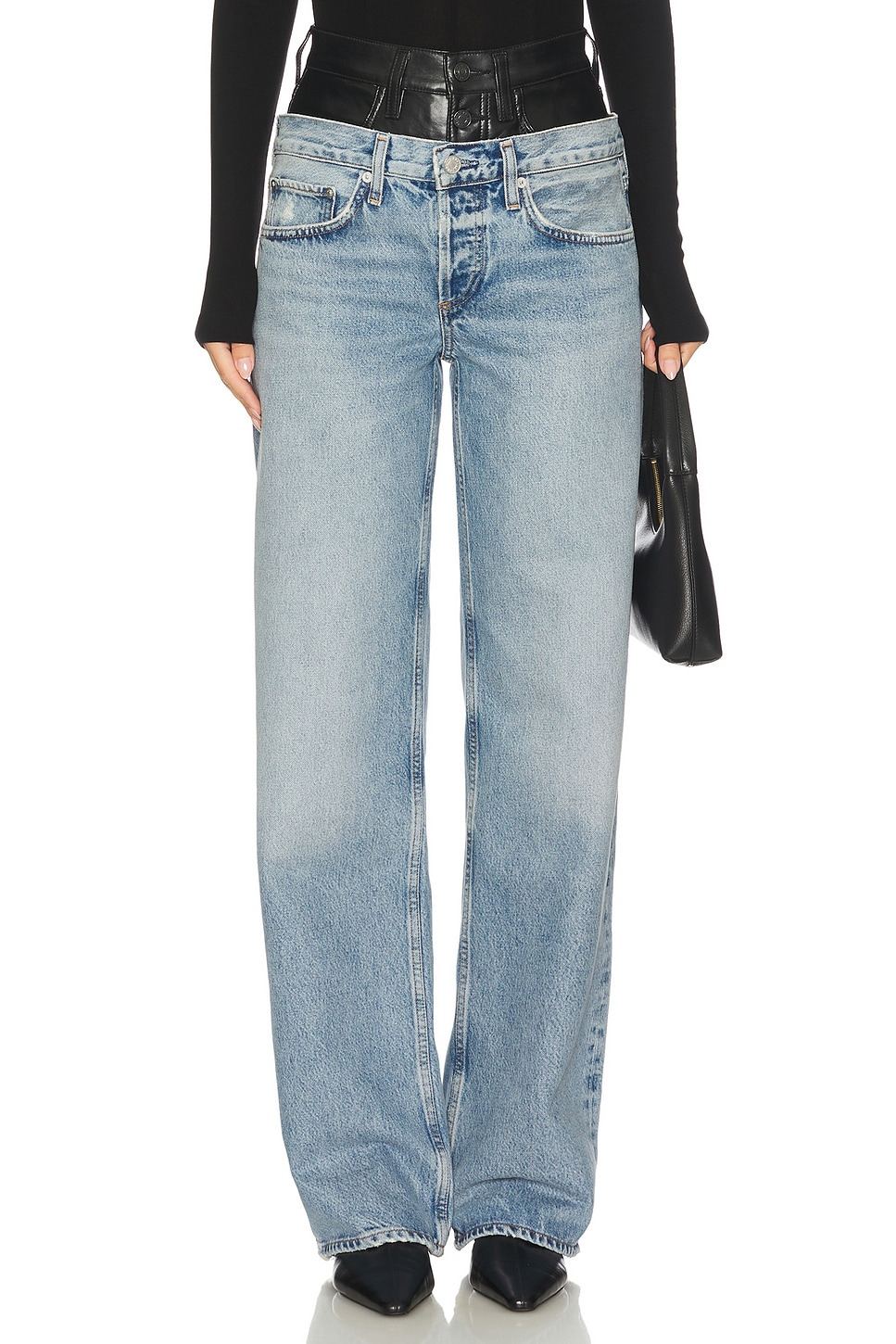 - Self: 67% Regenerative Cotton 22% Lyocell 11% Recycled Cotton Leather: 50% Recycled Leather 30% Polyurethane 10% Viscose 10% Polyester Lining: 95% Polyester 5% Elastane - Dry clean - Button-fly closures.19" at the leg opening - Revolve Style No. AGOL-WJ757 - Manufacturer Style No. A298-1885