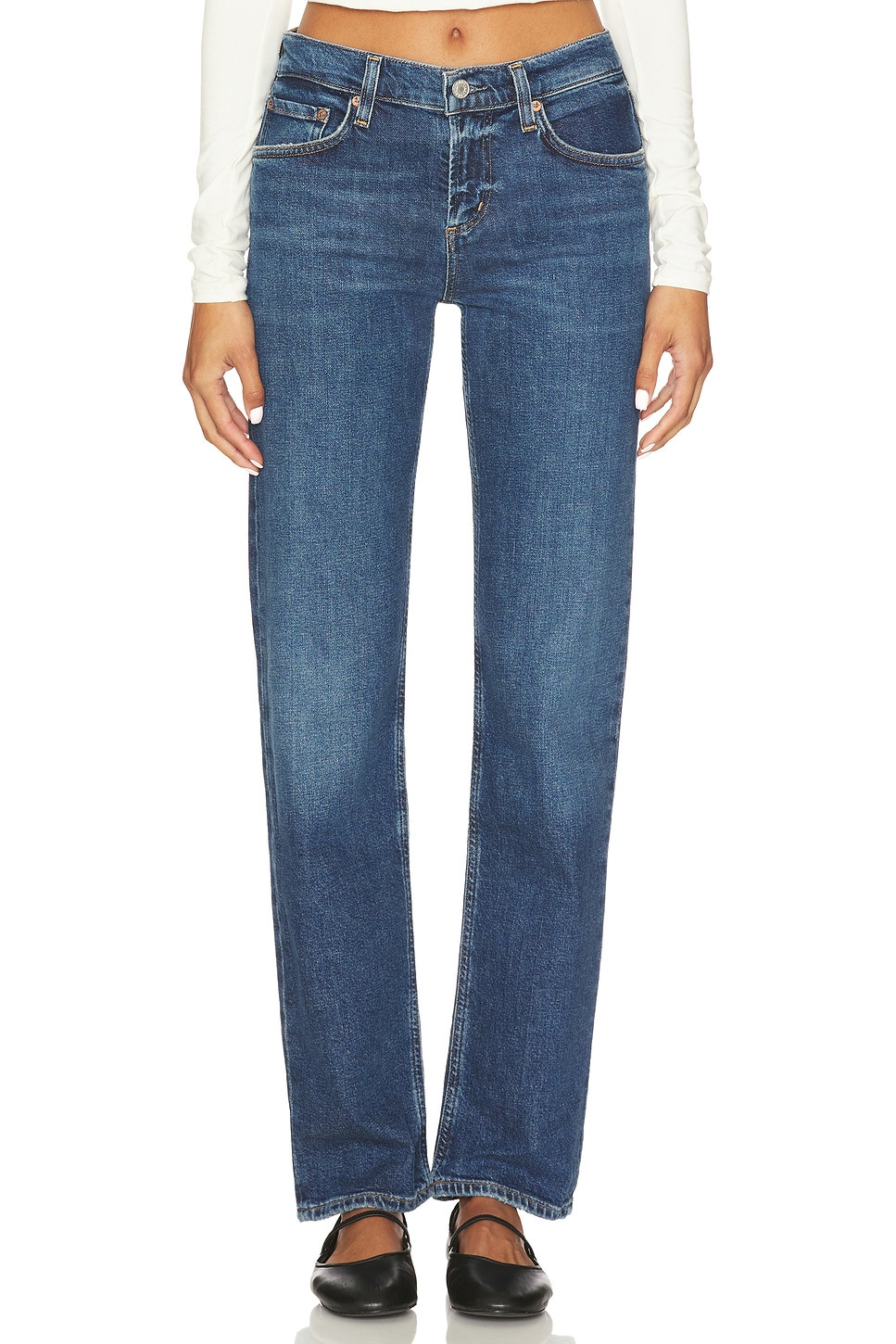 - 99% regenerative cotton 1% elastane - Machine wash - Zip fly with button closure.5-pocket design - Low-rise fit - Rigid denim fabric.14" at the leg opening - Revolve Style No. AGOL-WJ727 - Manufacturer Style No. A263-1858