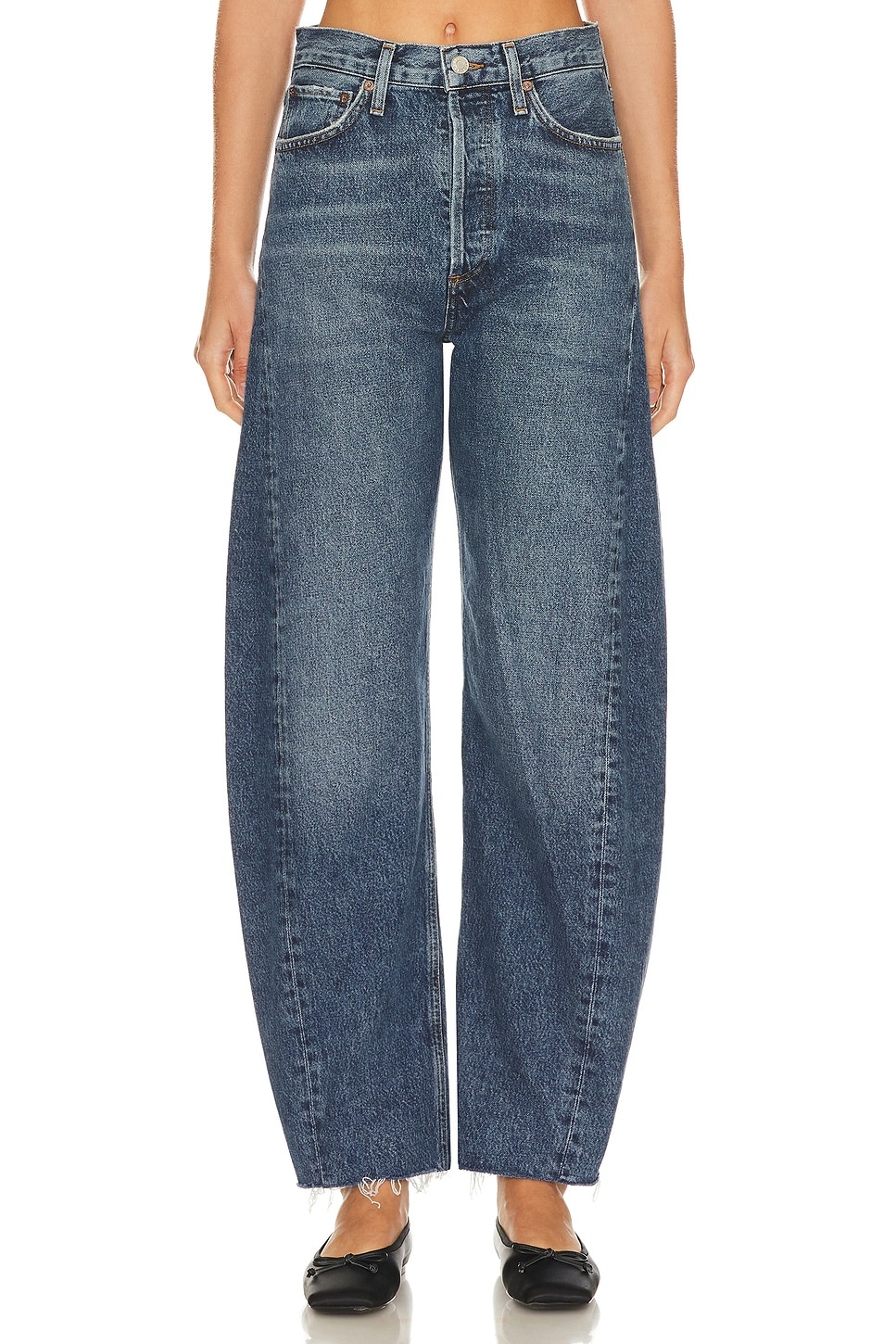 - Discover AGOLDE's Luna Pieced Wide Leg jeans in Control blue - a stylish fusion of fading, whiskering, and raw-cut cuffs with a bow legged silhouette for a casually chic look - .100% organic cotton - Made in Turkey - Machine wash - Button fly.5-pocket styling - Fading and whiskering at front with raw-cut cuffs.21" at the knee narrows to 15" at the leg opening - Revolve Style No. AGOL-WJ536 - Manufacturer Style No. A9039-1206