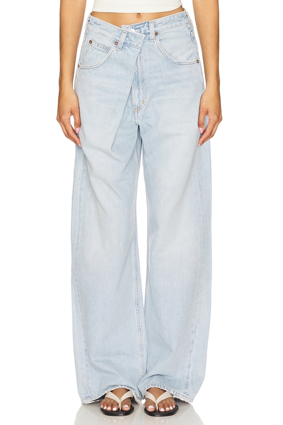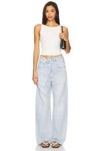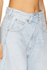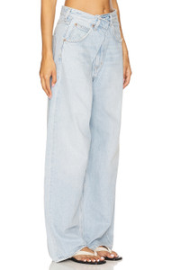 - 100% regenerative cotton - Machine wash cold - Zip fly and button closure.5-pocket design - Fold-in design at front with hidden hook and bar closure - Midweight rigid denim fabric with distressing at hems.23" at the knee narrows to 21" at the leg opening - Revolve Style No. AGOL-WJ698 - Manufacturer Style No. A241-1601