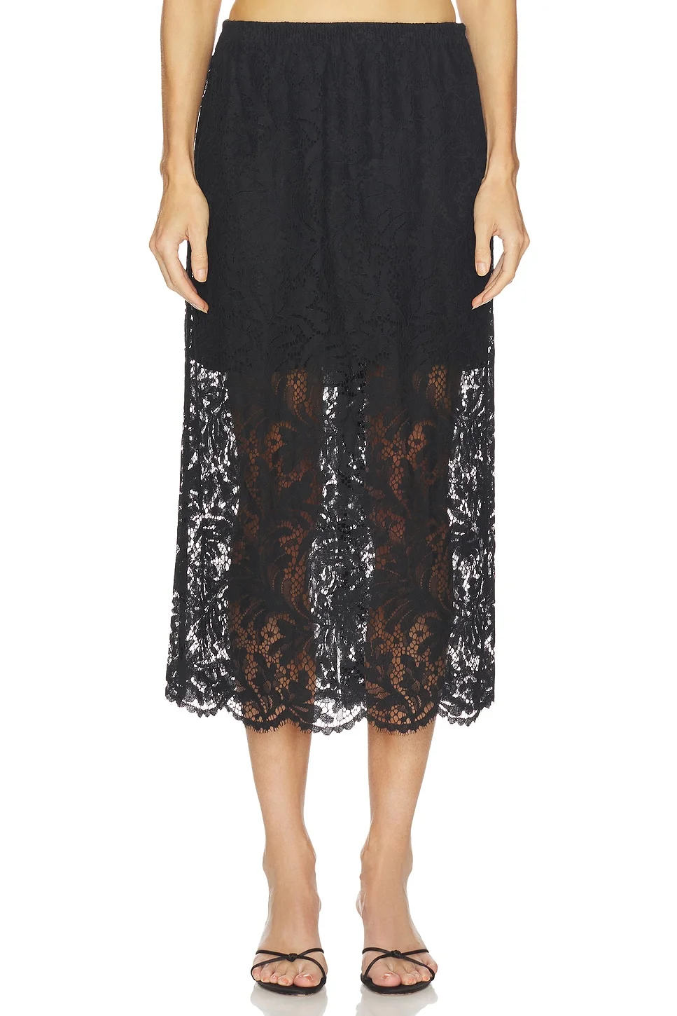 - 60% nylon 40% cotton - Made in China - Dry clean only - Partially lined - Pull-on styling - Lace overlay - Skirt measures approx 31" in length - Revolve Style No. ALX-WQ132 - Manufacturer Style No. 3SKRT00726