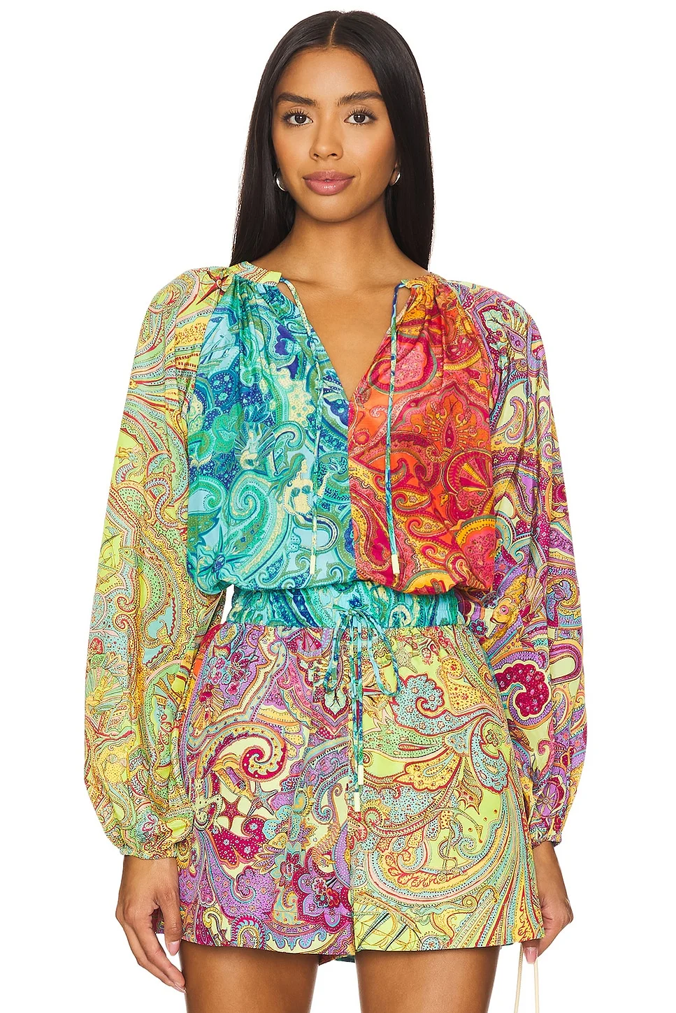 - 52% silk 48% cotton - Made in China - Dry clean - Pull-on styling - V-neck with single tie closure - Elastic cuffs - Lightweight poplin fabric - Item not sold as set - Revolve Style No. AMAI-WS9 - Manufacturer Style No. 3904T