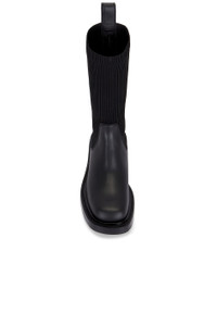 - Leather and ribbed knit upper with rubber sole - Made in Spain - Pull-on styling with stretch ribbed knit shaft - Leather footbed - Back pull-tab - Rounded square toe - Approx 32mm/ 1.25 inch heel Approx 260mm/ 10.25 inch shaft Shaft measures approx 12.56" in circumference - Revolve Style No. AWAR-WZ176 - Manufacturer Style No. 30424B030