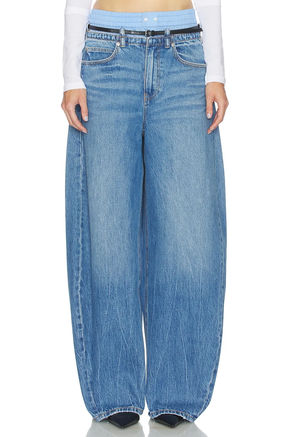 - Self: 100% cotton Trim: 72% cotton 24% polyamide 4% elastane Belt: 100% cow leather - Made in China - Machine wash cold - Zip fly with snap button closure - Midweight denim fabric - Intentional whiskering 5-pocket styling - Layered contrast fabric at waistband Waistbelt included.22" at the leg opening - Revolve Style No. AWAR-WJ76 - Manufacturer Style No. 4DC2264100