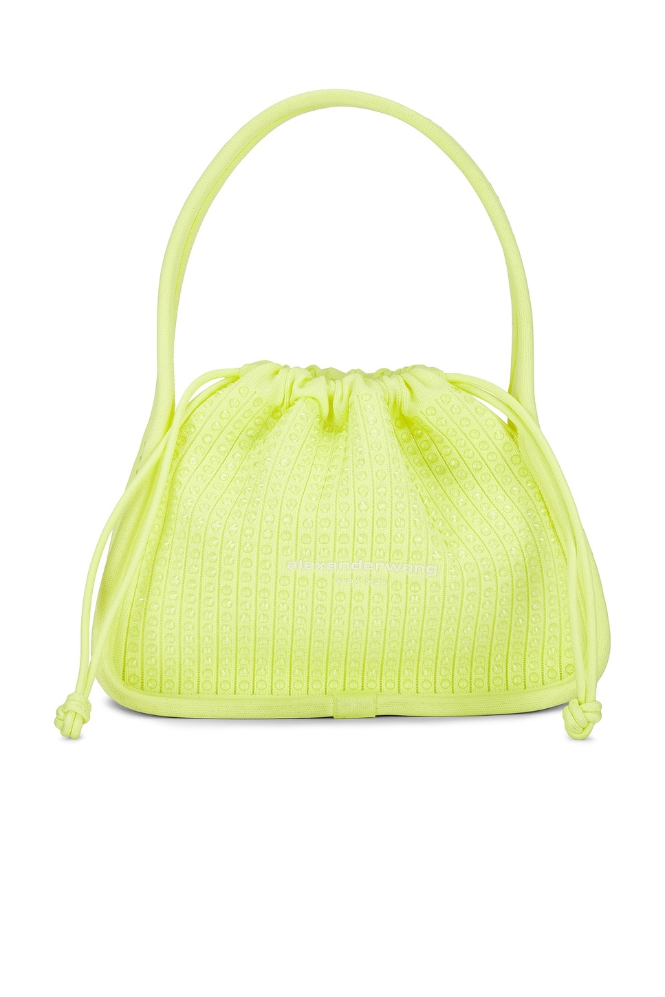 - Ribbed knit exterior with clear crystals and knit lining - Made in China - Top drawstring closure - One main compartment - Interior slip pocket - Integrated handle - Measures approx 9.5" W x 7.5" H x 3" D Top handle with a 4" drop - Revolve Style No. AWAR-WY144 - Manufacturer Style No. 20125R91T