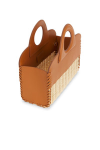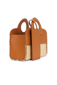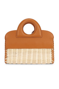 - Unlined woven rattan with leather trim - Made in China - Open top styling - One main compartment - Detachable zip pouch - Detachable leather shoulder strap - Measures approx 9" W x 6.5" H x 3.75" D Detachable shoulder strap with a 18" drop Top handle with a 2.5" drop Zip pouch measures approx 6.75" W x 3.25" H x 0.2" D - Revolve Style No. AXIS-WY4 - Manufacturer Style No. A42512010501