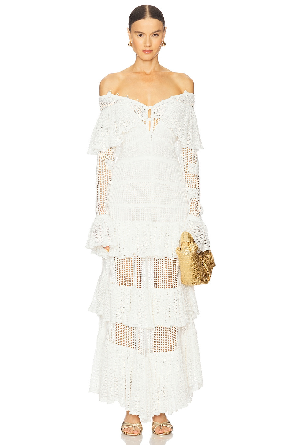 - 95% polyester 5% elastane - Hand wash - Detachable slip lining with adjustable shoulder straps, front hook and eye detail, and back zipper closure - Pull-on off shoulder styling with front loop button detail - Midweight crochet knit fabric with bell cuffs and subtly flounced hem - Revolve Style No. AXIS-WD887 - Manufacturer Style No. A1250449-0458