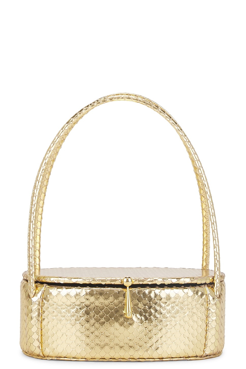 - Snake embossed cow leather exterior with textile lining - Made in China - Flap top with gold-tone hardware at front - One main compartment - Built-in mirror - Dual handles - Measures approx 8" W x 3" H x 5" D Top handle with a 8" drop - Revolve Style No. AXIS-WY8 - Manufacturer Style No. A42514010705