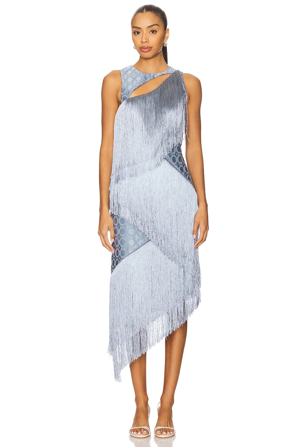 - Self: 65% cotton 35% rayon Lining: 95% polyester 5% elastane - Dry clean only - Fully lined - Hidden back zipper closure - Front cut-out detail - Fringe detail - Satin fabric with asymmetrical hem - Revolve Style No. AXIS-WD916 - Manufacturer Style No. A2250417-0668