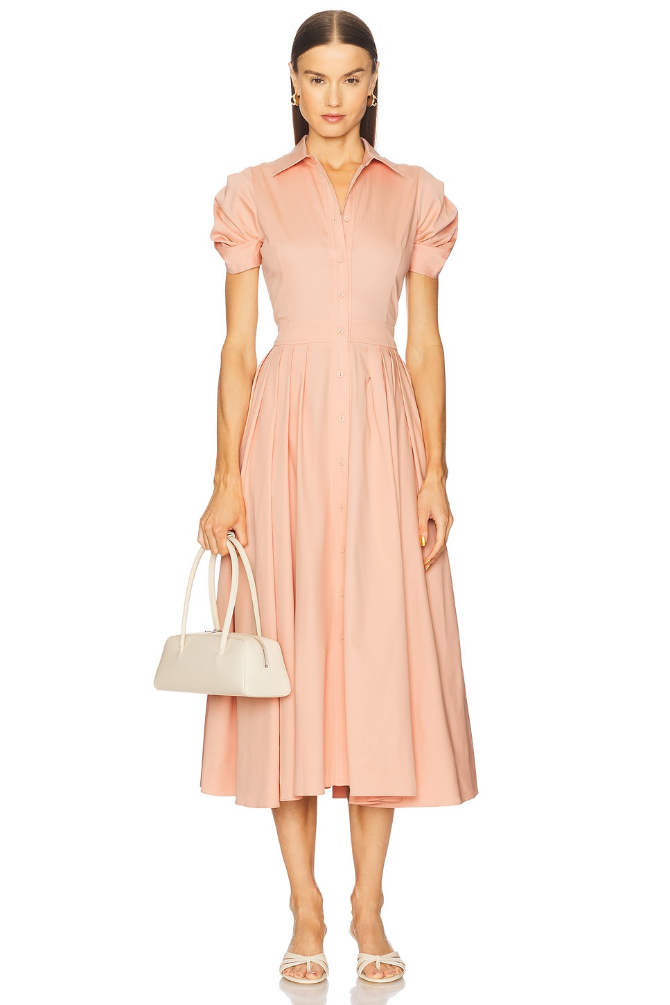 - 53% cotton 43% viscose 4% elastane - Dry clean only - Unlined - Front button closure - Ruched puff sleeves - Crisp poplin fabric with pleated skirt and side seam pockets - Revolve Style No. AXIS-WD894 - Manufacturer Style No. A1250403-0308