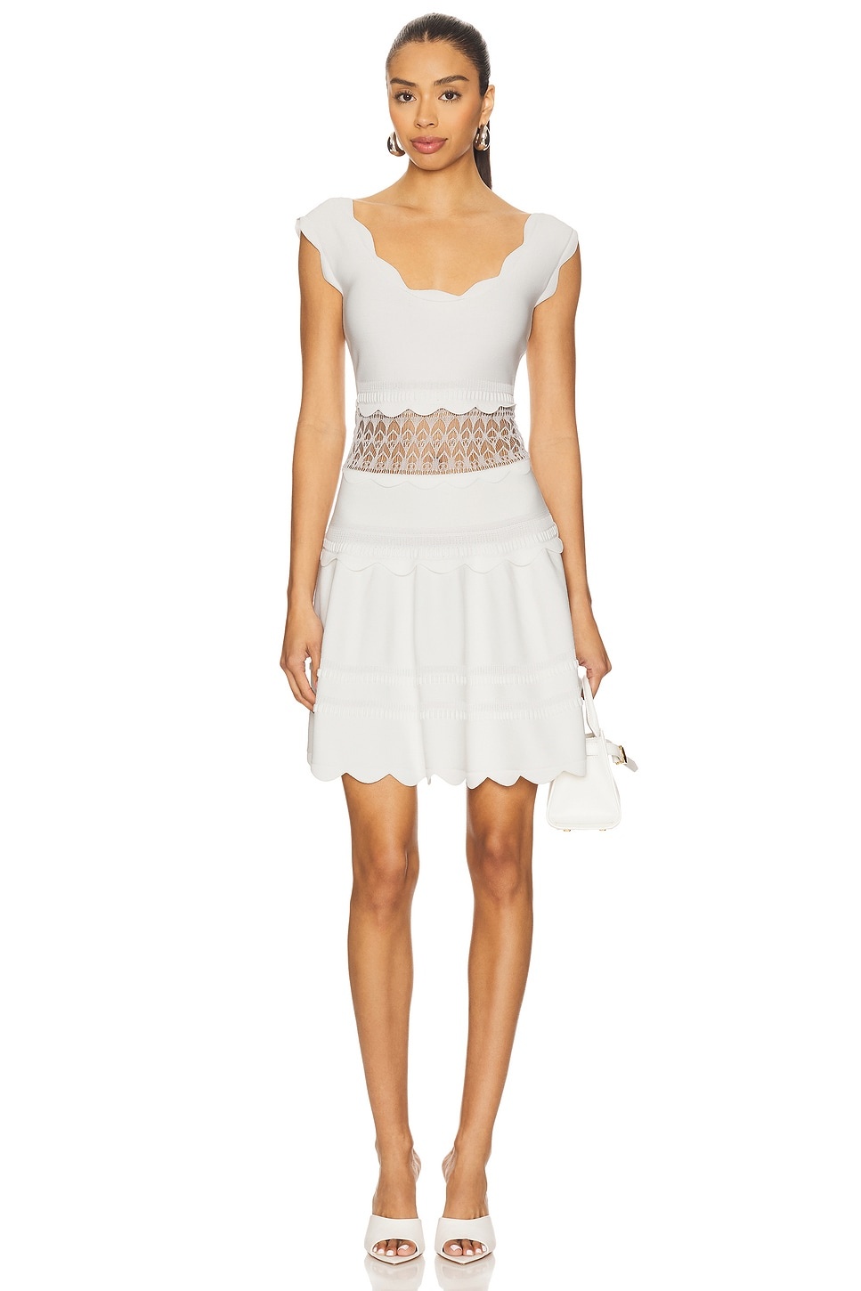 - 80% viscose 20% nylon - Dry clean only - Unlined - Sheer lace panel at waist - Scalloped trim - Midweight knit fabric with ruffled and textured detailing throughout - Revolve Style No. AXIS-WD876 - Manufacturer Style No. A1250339-0462