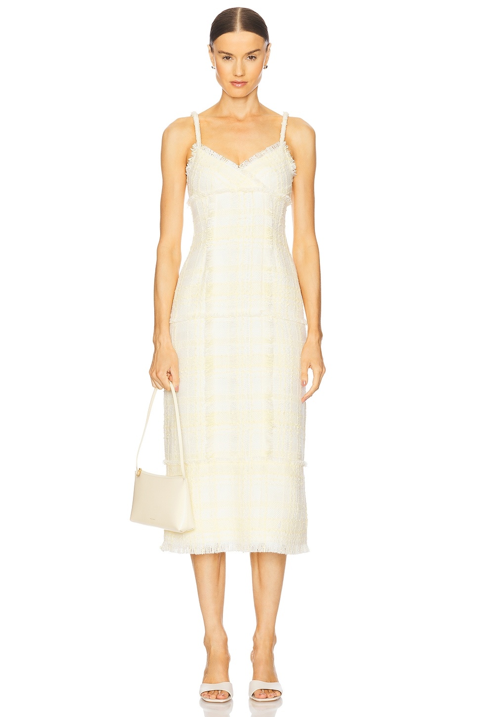 - Self: 100% polyester Lining: 95% polyester 5% elastane - Made in China - Dry clean only - Fully lined - Hidden back zipper closure - Tweed fabric with frayed trim - Revolve Style No. AXIS-WD850 - Manufacturer Style No. A4250411-0032