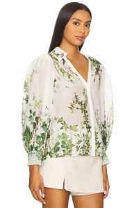 - Self: 70% cotton 30% silk Lining: 100% polyester - Dry clean only - Front button closure - Elasticized cuffs - Puff sleeves - V-neck design - Lightweight linen fabric - Garment is made with a semi-sheer fabric, undergarments can show through - Revolve Style No. ALI-WS694 - Manufacturer Style No. CC506P55010