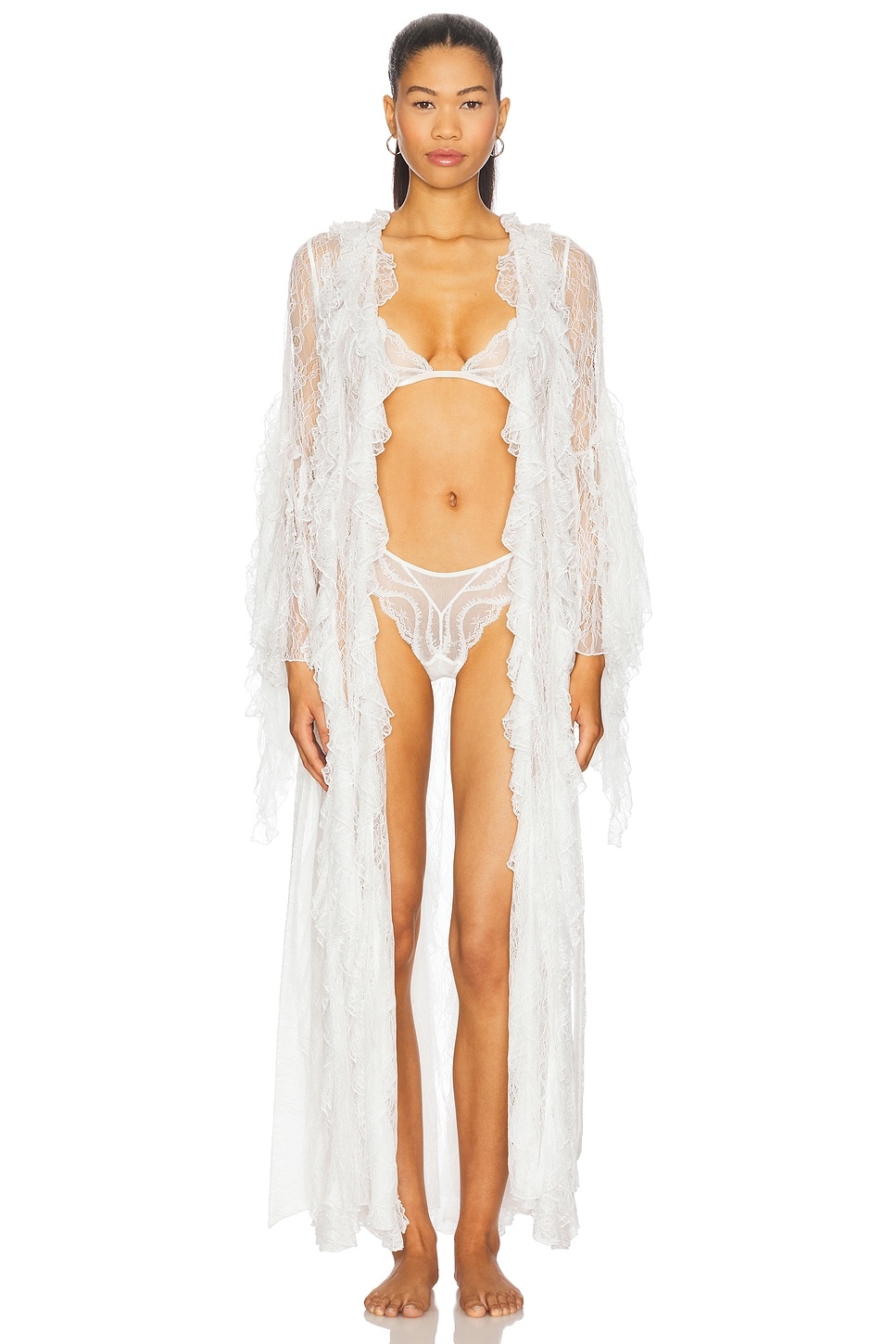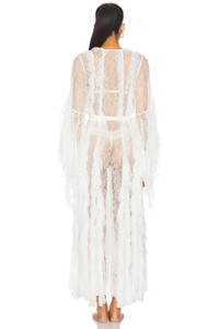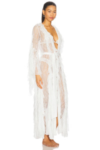- Self: 100% nylon Contrast Fabric: 100% polyester - Dry clean only - Tonal waist tie closure - Flared ruffled sleeves - Lightweight sheer lace fabric with ruffled trim throughout - Garment is intentionally sheer, undergarments will show through - Please note undergarment not included - Item not sold as set - Revolve Style No. ALI-WI1 - Manufacturer Style No. CC504703222