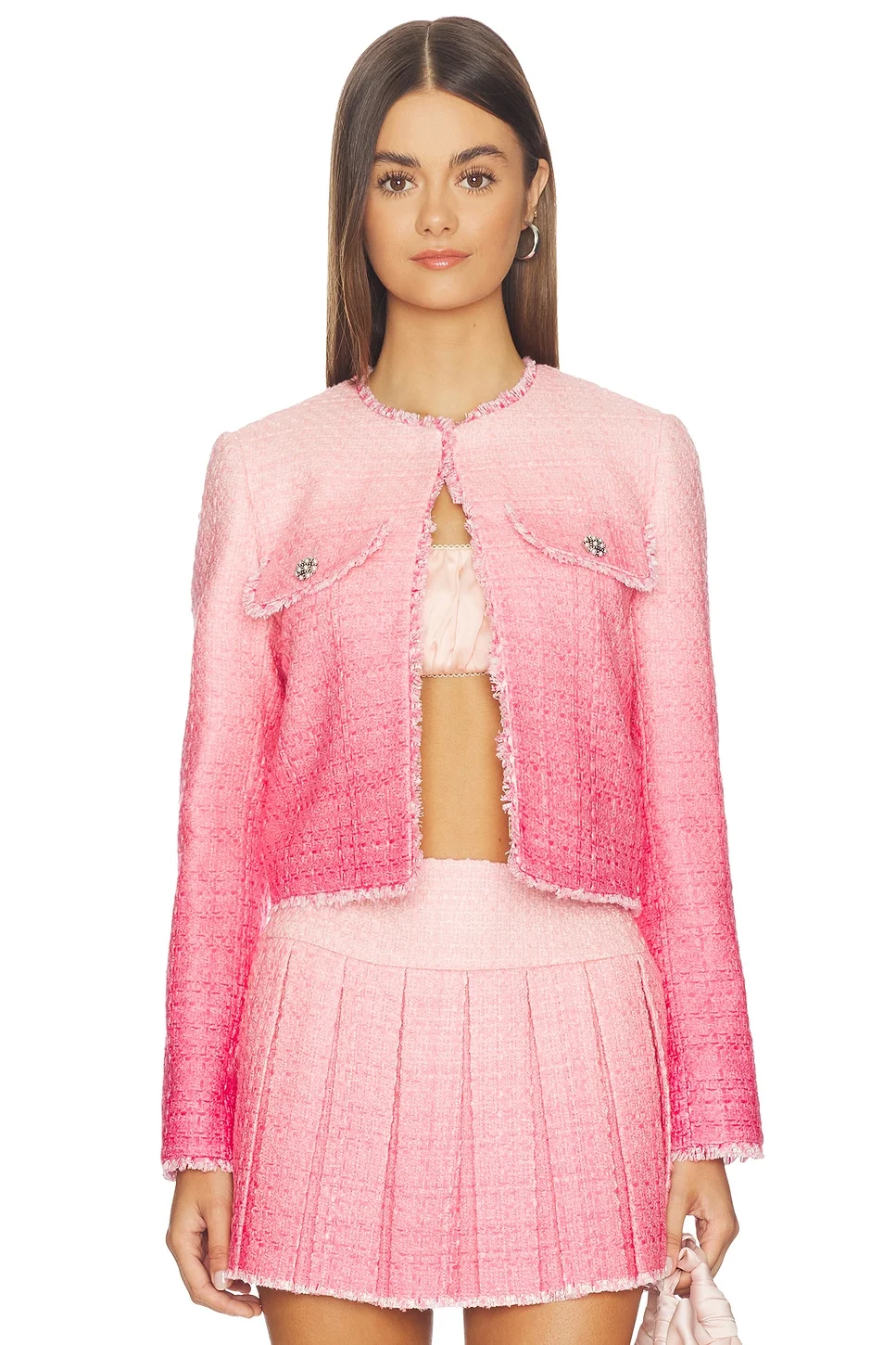 - Self: 63% polyester 37% acrylic Combo & Lining: 100% recycled polyester - Made in Vietnam - Professional dry clean only - Front hook and bar closure - Midweight tweed fabric - Dual button-flap breast pockets - Frayed trim - Revolve Style No. ALI-WO281 - Manufacturer Style No. CC602P70209