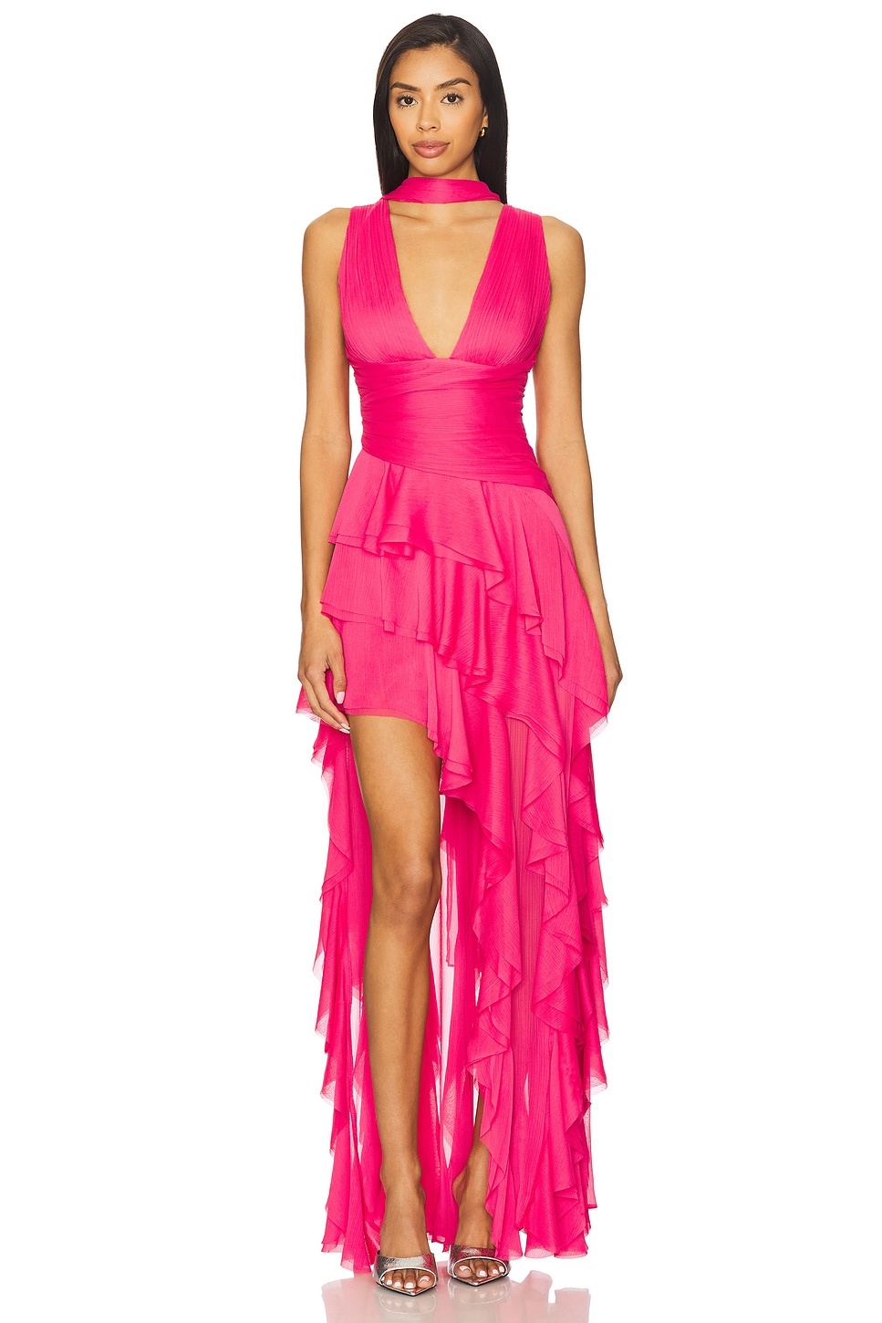 - Self: 100% polyester Lining: 95% polyester 5% elastane - Dry clean only - Fully lined - Hidden side zipper closure - Pleated chiffon fabric with tiered skirt - Includes chiffon scarf - Revolve Style No. ALI-WD1192 - Manufacturer Style No. CC504016519