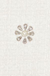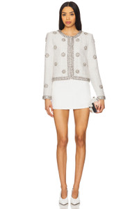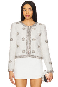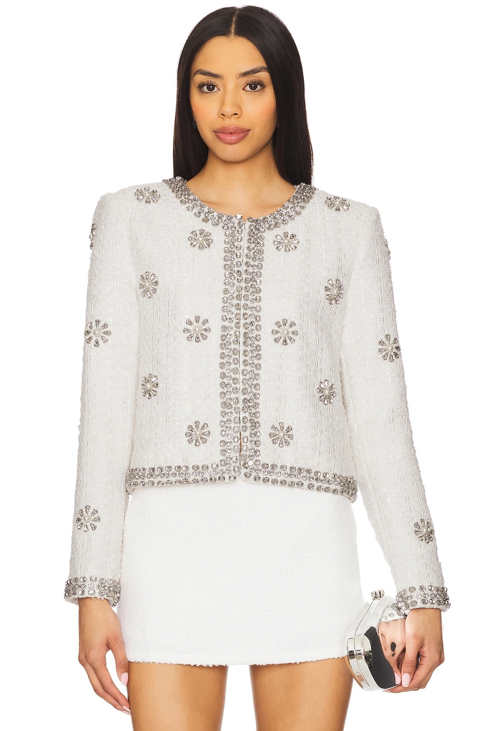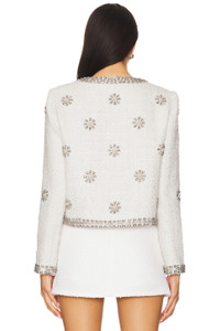 - Self: 95% polyester 5% other fibers Lining: 100% polyester - Dry clean only - Front hook and eye closure - Stone embellishment throughout - Midweight tweed fabric with padded shoulders - Revolve Style No. ALI-WO265 - Manufacturer Style No. CC503E37214