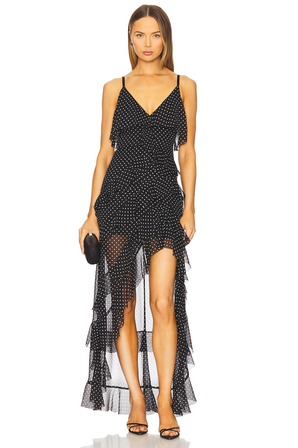 - Self: 100% polyester Lining: 95% recycled polyester 5% elastane Contrast Fabric: 100% silk - Dry clean only - Partially lined - Lace-up tie closure and back zipper closure - Adjustable shoulder straps - Asymmetrical hem - Midweight ruffled chiffon fabric - Revolve Style No. ALI-WD1188 - Manufacturer Style No. CC504P62558