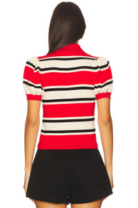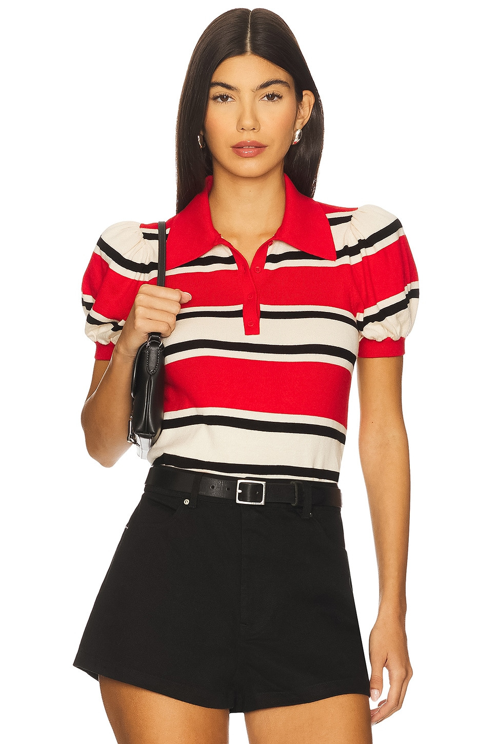 - Self: 96% cotton 4% nylon Contrast Fabric 1:100% polyester Contrast Fabric 2: 100% nylon - Dry clean only - Front partial button closure - Puff sleeves - Ribbed trim - Cropped fit - Midweight knit fabric - Revolve Style No. ALI-WK221 - Manufacturer Style No. CC508514713