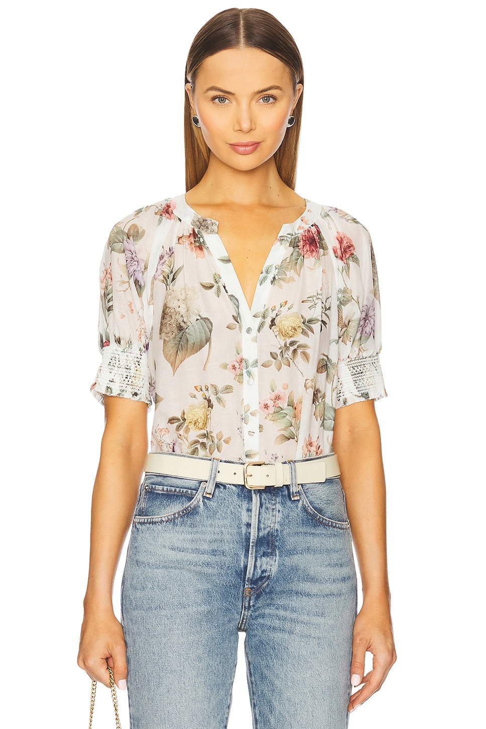 - 70% cotton 30% silk - Dry clean only - Partial front button closures - Subtle puff sleeves with smocked elastic cuffs - Lightweight semi-sheer chiffon fabric - Garment is made with a semi-sheer fabric, undergarments can show through - Revolve Style No. ALI-WS681 - Manufacturer Style No. CC504P19036