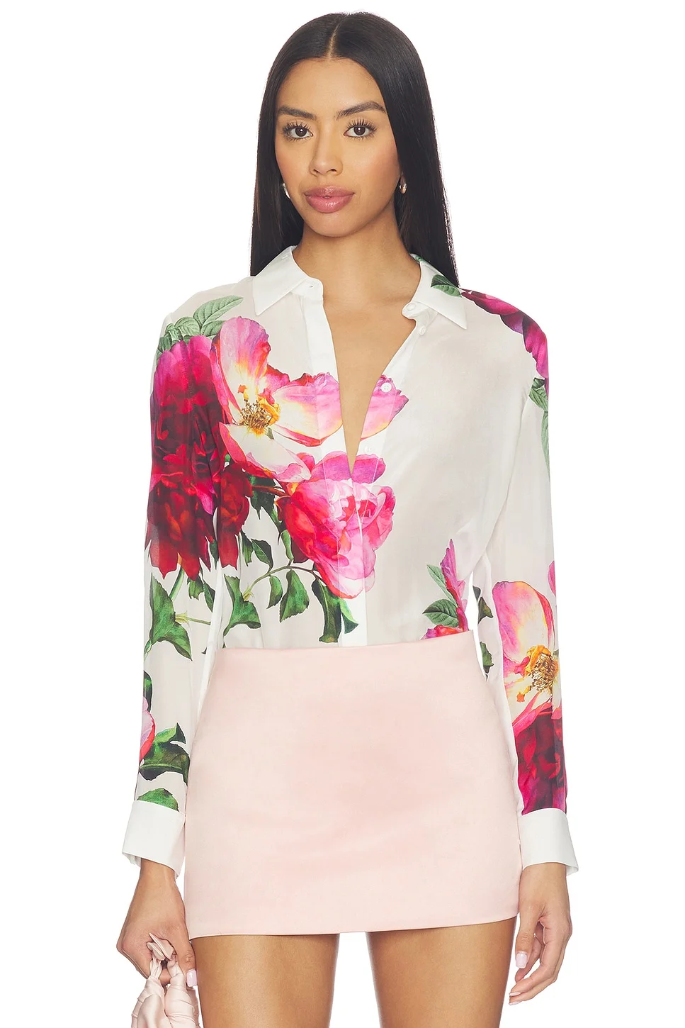 - 100% silk - Made in China - Dry clean only - Hidden front button closure - Adjustable button cuffs - Sheer crepe fabric - Garment is intentionally sheer, undergarments will show through - Please note undergarment not included - Revolve Style No. ALI-WS717 - Manufacturer Style No. CC602P29032