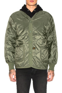 - Self & Lining: 100% nylon Filling: 100% poly Knit: 99% poly 1% spandex - Made in China - Machine wash - Button front closures - Front pockets - Rib knit cuffs - Quilted fabric - Revolve Style No. ALPF-MO34 - Manufacturer Style No. MJL48000C1