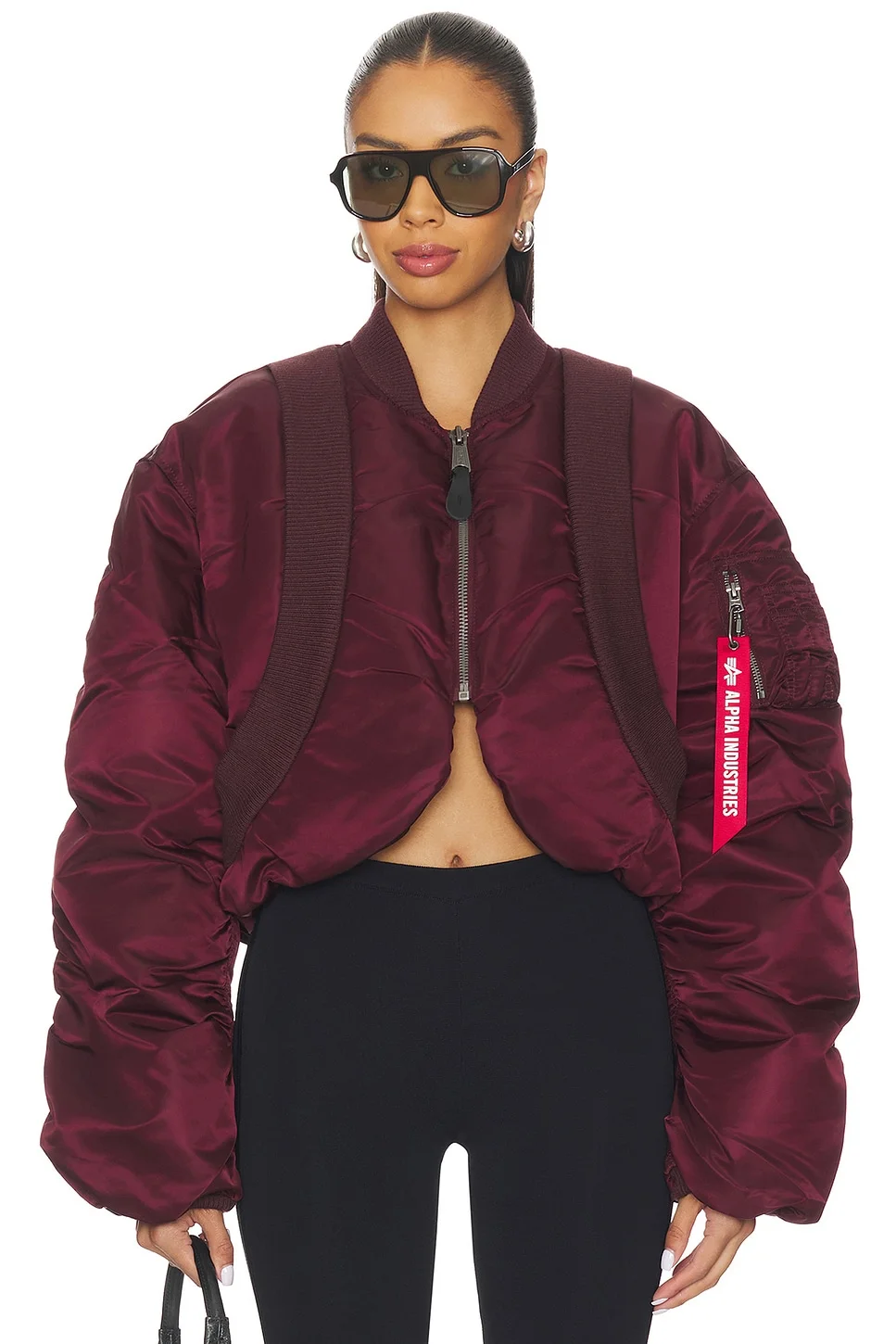 - Self: 100% nylon Filling: 100% polyester Contrast Fabric: 88% Acrylic 11% polyester 1% spandex - Made in China - Dry clean only - .Front zipper closure - Ribbed trim - Padded ripstop fabric - Side pockets - Revolve Style No. ALPR-WO116 - Manufacturer Style No. WJK55500C1