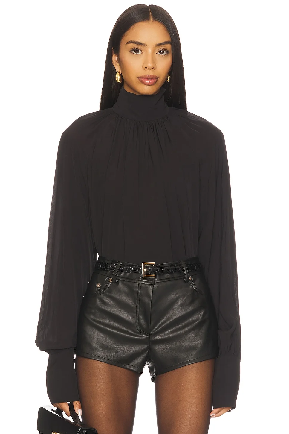 - 100% viscose - Made in China - Machine wash cold - Pull-on styling - Lightweight georgette fabric - Mockneck styling - Garment is intentionally sheer, undergarments will show through - Please note undergarment not included - Revolve Style No. ANIN-WS436 - Manufacturer Style No. A-07-11598-BLK26