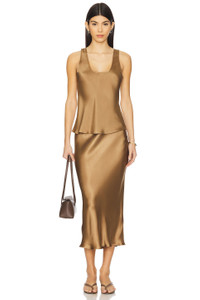 - 100% silk - Made in China - Dry clean only - Unlined - Pull-on styling with elastic waistband - Lightweight sateen fabric - Item not sold as set - Skirt measures approx 34.5" in length - Revolve Style No. ANIN-WQ67 - Manufacturer Style No. A-04-4001-DKG22