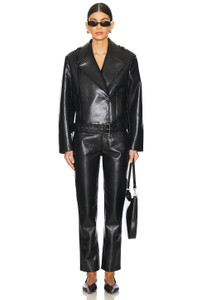 - 48% leather 27% polyurethane 25% polyester - Made in China - Hand wash - Zip fly and button closure.5-pocket design - Lightweight faux leather - Item not sold as set.16" at the knee narrows to 14" at the leg opening - Revolve Style No. ANIN-WP97 - Manufacturer Style No. A-03-10307-BLK26