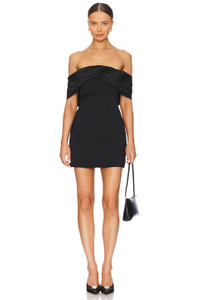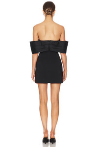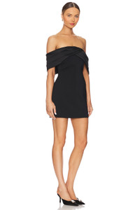 - Self: 97% viscose 3% spandex Lining: 95% polyester 5% spandex Contrast Fabric: 100% polyester - Made in China - Dry clean only - Fully lined - Hidden back zipper closure - Off the shoulder styling with boned bodice and non-stick silicone grip trim - Midweight crepe fabric - Neckline to hem measures approx 26" in length - Revolve Style No. ANIN-WD90 - Manufacturer Style No. A-02-10321-BLK26