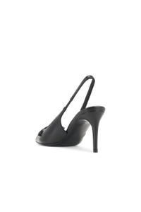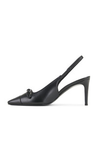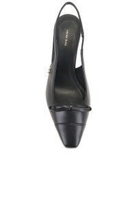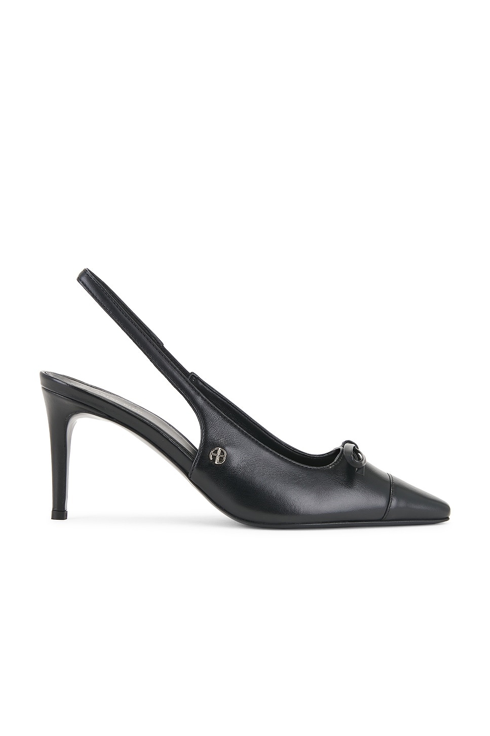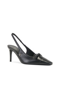 - Leather upper and leather sole - Sling back styling - Leather footbed and lining - Bow accent at vamp - Side gold-tone logo detailing - Square toe - Stiletto heel - Approx 75mm/ 3 inch heel - Revolve Style No. ANIN-WZ147 - Manufacturer Style No. A-14-10794-BLK1