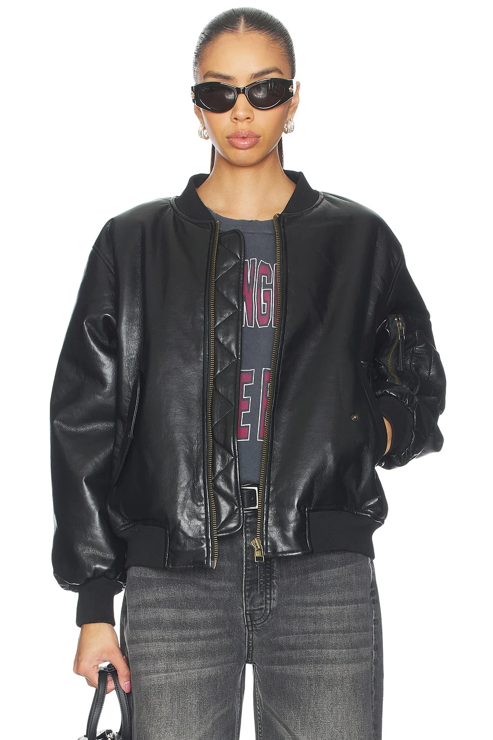 - Self: 48% leather 27% polyurethane 25% polyester Lining: 57% polyester 43% viscose - Dry clean only - Front zip closure - Front snap button pockets - Side seam pockets - Elasticized ribbed trim - Cropped fit - Heavyweight leather fabric - Revolve Style No. ANIN-WO233 - Manufacturer Style No. A-01-10909-BLK6